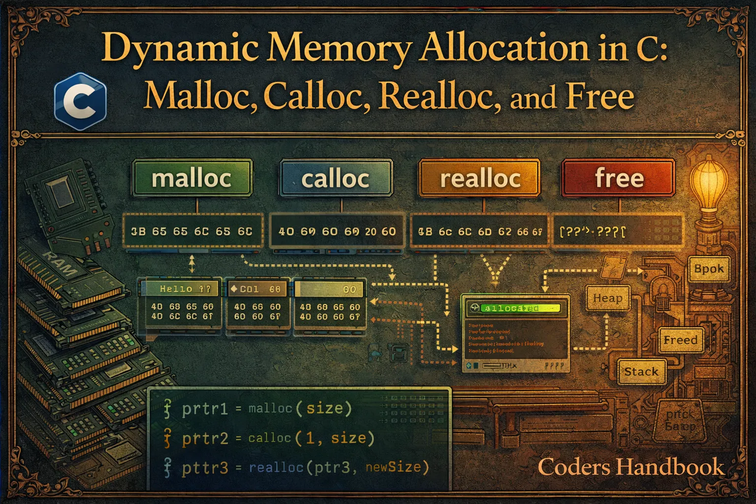 Complete guide to dynamic memory allocation in C. Master malloc, calloc, realloc, free and avoid memory leaks with best practices.